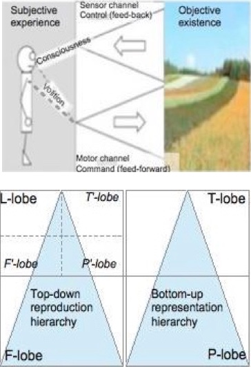 It has long been known, but is still not widely appreciated, that the tetrapod brain can be functionally approximated by a pair of duplex (counterflow), hierarchical information processors, one for input, and the other for output. This is as true for humans as it is for fishes. Indeed, we probably share the underlying teleology with most arthropods. The figure at left depicts this basic processor design. Using the ' poverty of stimulus' argument, Noam Chomsky further inferred that linguistic principles underly all higher order brain operations. That is, its internal functioning could be interpreted via syntax and semantics, the familiar mechanisms of message transfer.