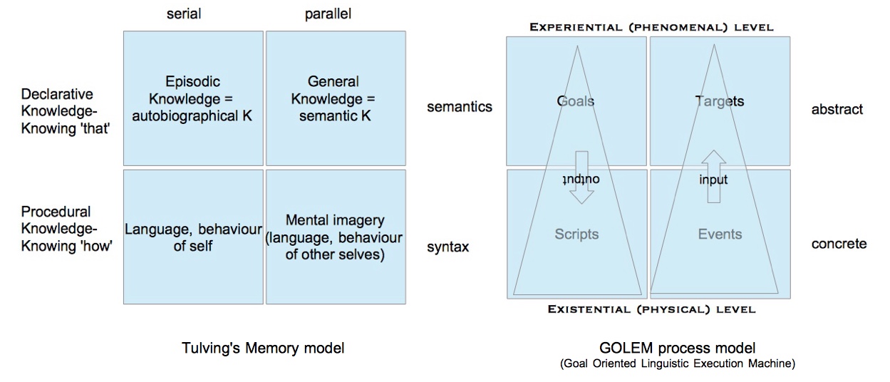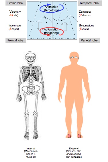 First consider the right-hand, afferent (bottom-up) hierarchy of the GOLEM (Goal-Oriented Linguistic Emulation of Mind). Whenever sensory inputs increase to super-threshold levels, they become sensory events. All understanding of the surrounding world follows from pressure events on skin, or pressure-like events on modified internal skin patches such as the retinas and the eardrums. Remember also that otoliths in the inner ear respond to inertial inputs (accelerations). Certain patterns of multiple events are interpreted (abstracted) as numerically smaller matching patterns (or percepts). That is, there has been a hierarchical compression of information. For example, the sequences of pressure events on the soles of the feet are interpreted as self-motion (eg walking). This is an information process called automation, or triggering.