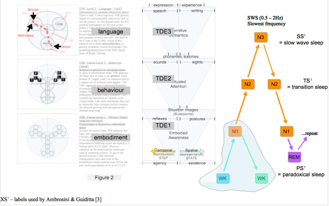 The first of these two systemic requirements means that during waking periods, the brain must generate meta-inhibition of default mode excitatory layers. The task of the descending reticular formations (DRAS) is to maintain default (background) excitation of 'hardware'/body organisational hierarchies, together with superimposed inhibitory signals, resulting in tonic readiness of neural circuitry. This is sometimes called 'standby' mode after the design of digital televisions in which purpose of the handheld remote control is paradoxical- to 'switch off the off switch' if you will. The more technical term is meta-inhibition*. Meta-inhibitory, or standby, systems have very low latency, but rather high cost when 'idling'. Warm-bloodedness is the best known biological standby scheme, enabling mammals to get the 'jump' on their reptile competitors on cold frosty mornings. However, there is a cost- mammals must hunt for regular meals, unlike reptiles, which can lie in wait until the next opportunity.