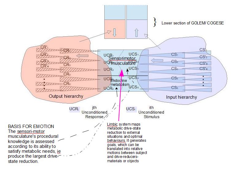 So what is really going on here? The selection of the right target CR* represents the most basic type of behavioural evaluation (feedback). Each reflex 'thread' or unit is being judged on the basis of its ability to satisfy the endocrine drive (the autonomic, homeostatically governed UCS, eg thirst, hunger, which are all types of pain reduction) which lies at its core, and is in fact the very reason it exists in the first place. At higher levels of abstraction, this simple act of performance evaluation (did it work?) morphs into the far more complex, and multi-hued system-state evaluation we call Emotionality. This idea is depicted in figure X.1 below. Feelings about ourselves and feelings about our current situation are not independent- indeed, the former is in most, though not all cases dependent on the latter. Therefore we seek those situations familiar enough to to win our interest and fealty, yet novel enough to be profitable.