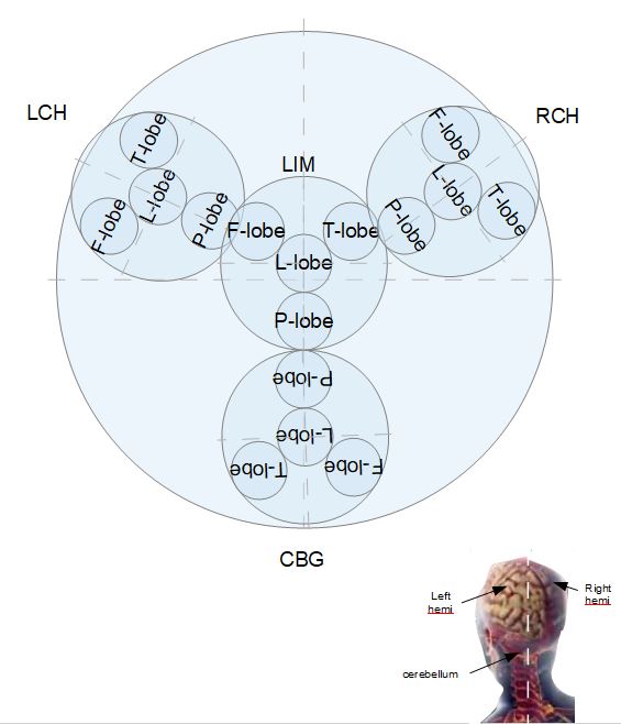 In other words, the metabolic drive-state differentials in the L-lobe act as the internal drivers of external behaviour- agency flows outward from them to the generators of external behaviour- the F-, T- and P-lobes which surround the L-lobe. Figure X.1, which is based on a modified GOLEM model, attempts to describe this complex state of affairs, but fails to generate the clarity needed. The TDE fractal architecture (see figure X.2 below) is morphologically equivalent to the GOLEM, but is able to display the finer functional distinctions with greater clarity. The TDE pattern also matches the actual arrangement of lobes in the real brain. The labels in figure X.2 (eg LCH as the global F-lobe, etc) have been explained fully in sections 1..9 of this website.