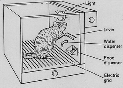 The important factor to remember when learning these paradigms**, is to understand how they help animals to survive in the wild, both individually and together. CC and OL are the afferent and efferent constituents of the compounded form of behaviour, the extended reflex. CC is the representational phase, performing a predictive, cybernetically feedforward, role. In this 'front-end' role, single conscious tokens of a given perceptual property class are dynamically linked to their appropriate (and unconscious, of course) endocrine function, thenceforth acting as its sensory trigger. OL is the second, trial-and-error phase. The goal seeking mechanism (a cybermaton) recursively decomposes the drive-state differential into trial and error TOTE cycles*** . These cycles test-and-reject various UCR-CR* candidates, until the test-and-accept step, indicating that the correct CR* (the one that triggers the CS* to a sufficient degree) has been identified. This can happen very quickly indeed- witness the rodent placed into a metal box (called a Skinner Box after B.F. Skinner- see Figure X.a below) in which the floor is (mildly) electrified. The animal jumps around in discomfort, making random movements (a form of non-directed experimentation). After a short period of time**, it accidentally pushes the 'off' switch (usually a foot pad or lever) -after all, it is a small box. On each subsequent occasion it takes less and less time to cancel the aversive stimulus, until it goes directly to the off-switch. The animal is deemed to have learned the 'operant'. O.L. demonstrates Thorndike's Law of Effect.